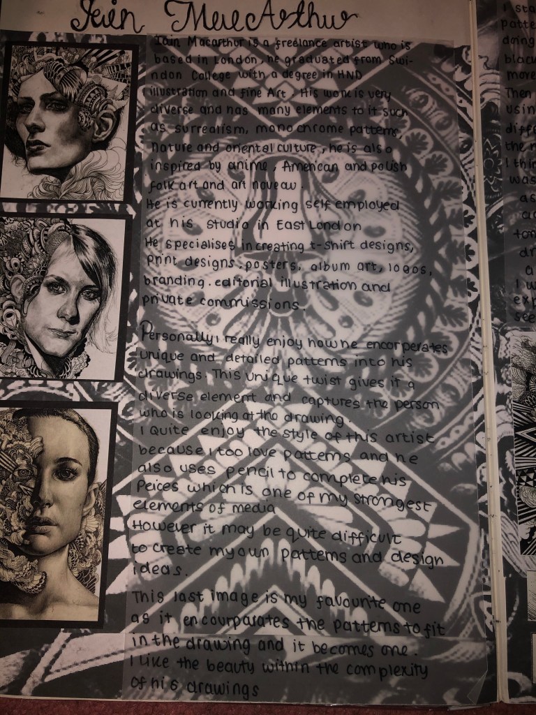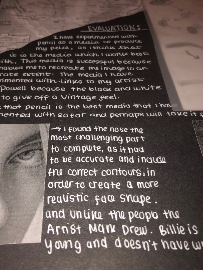 In your annotations you should always link back your work to the artist your taking inspiration from for example mentioning similarities between yours and their work , and also mention if you’ve added a little twist of your own into your drawing. Also talk about what elements you like in your drawing and what you dislike. Explore the media you have used (e.g pencil, pen, crayon or ink) and evaluate what you like and dislike about your media choice, and how you will improve in the future. Make sure to talk about tones, light ,reflection and shadows in your drawing when necessary.